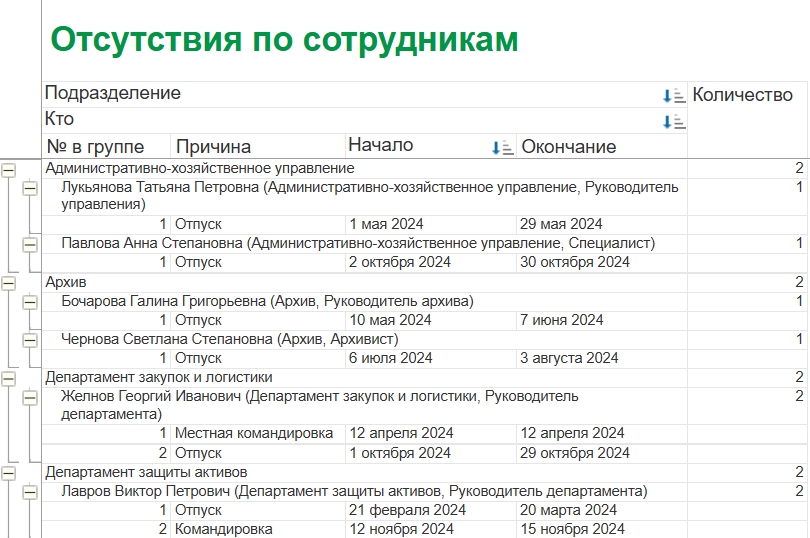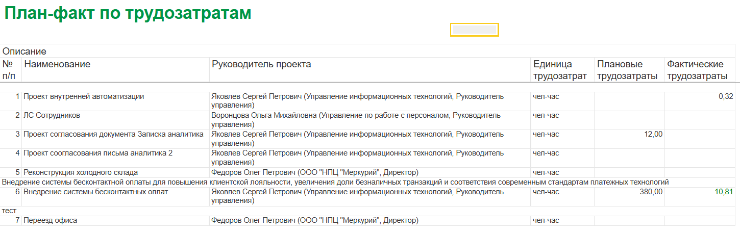 - Процесс: Система позволяет строить сводные отчеты, которые отображают информацию в разрезе отделов, проектов и сотрудников.