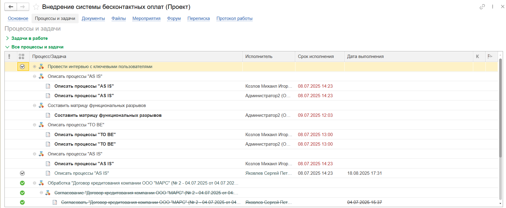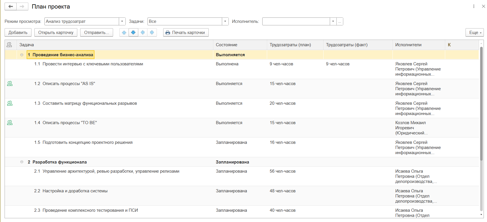 - Процесс: Для каждого проекта создается централизованное рабочее пространство, в котором формируется иерархия задач. Каждой задаче назначаются ответственные, сроки, приоритеты и прикрепляются все соответствующие документы — от технических заданий до отчетов о выполнении. Ключевой элемент — учет фактических трудозатрат: исполнители фиксируют время, затраченное на каждую задачу, непосредственно в системе.