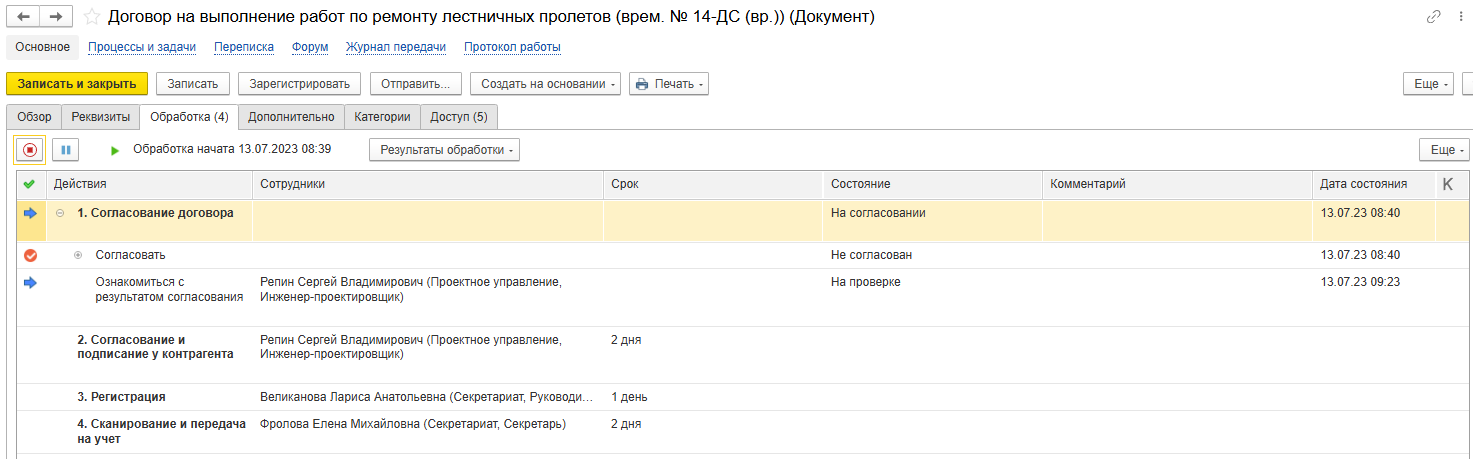Ключевое отличие от простого файлового хранилища — документ в 1С:Документооборот никогда не существует сам по себе. Он всегда привязан к конкретной Задаче в рамках более крупного Процесса или Проекта. Документ становится неотъемлемой частью контекста: «Согласовать коммерческое предложение по проекту «Х», «Зарегистрировать претензию от клиента «Y», «Исполнить поручение №Z по итогам совещания». Это устраняет непонимание среди сотрудников — каждый точно знает, что нужно сделать с документом, зачем и в какие сроки.