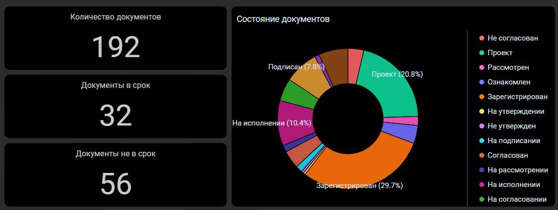 Руководитель получает персональный отчет, настраиваемый по желанию, или дашборд , который в режиме реального времени отображает ключевые метрики: количество неисполненных поручений, список документов с истекшим сроком согласования, загрузку сотрудников, статистику по этапам критических проектов. Это позволяет реагировать на проблемы проактивно, а не постфактум.
