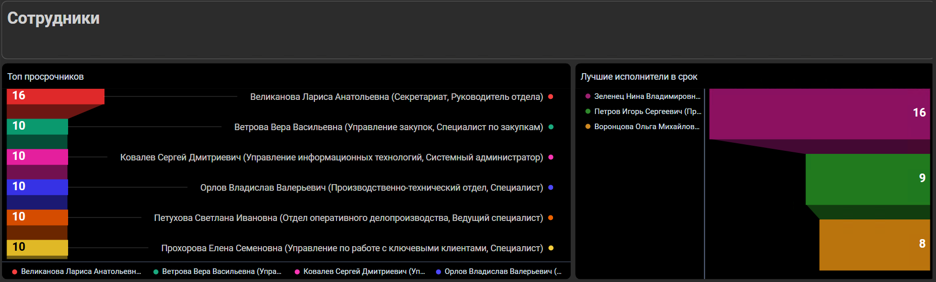 - Балансировка ресурсов: Руководство может объективно оценить загрузку подразделений и отдельных сотрудников, предотвратить их перегрузку и равномерно распределить работу.