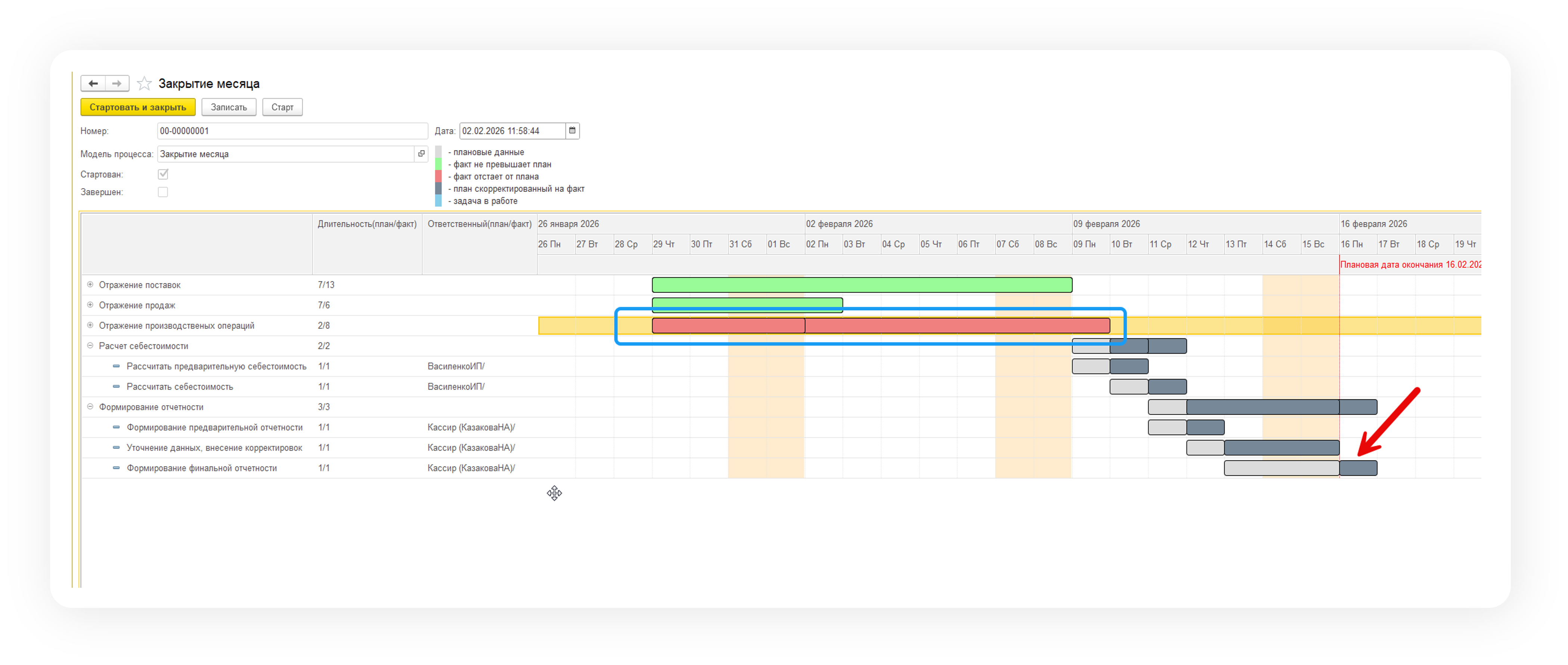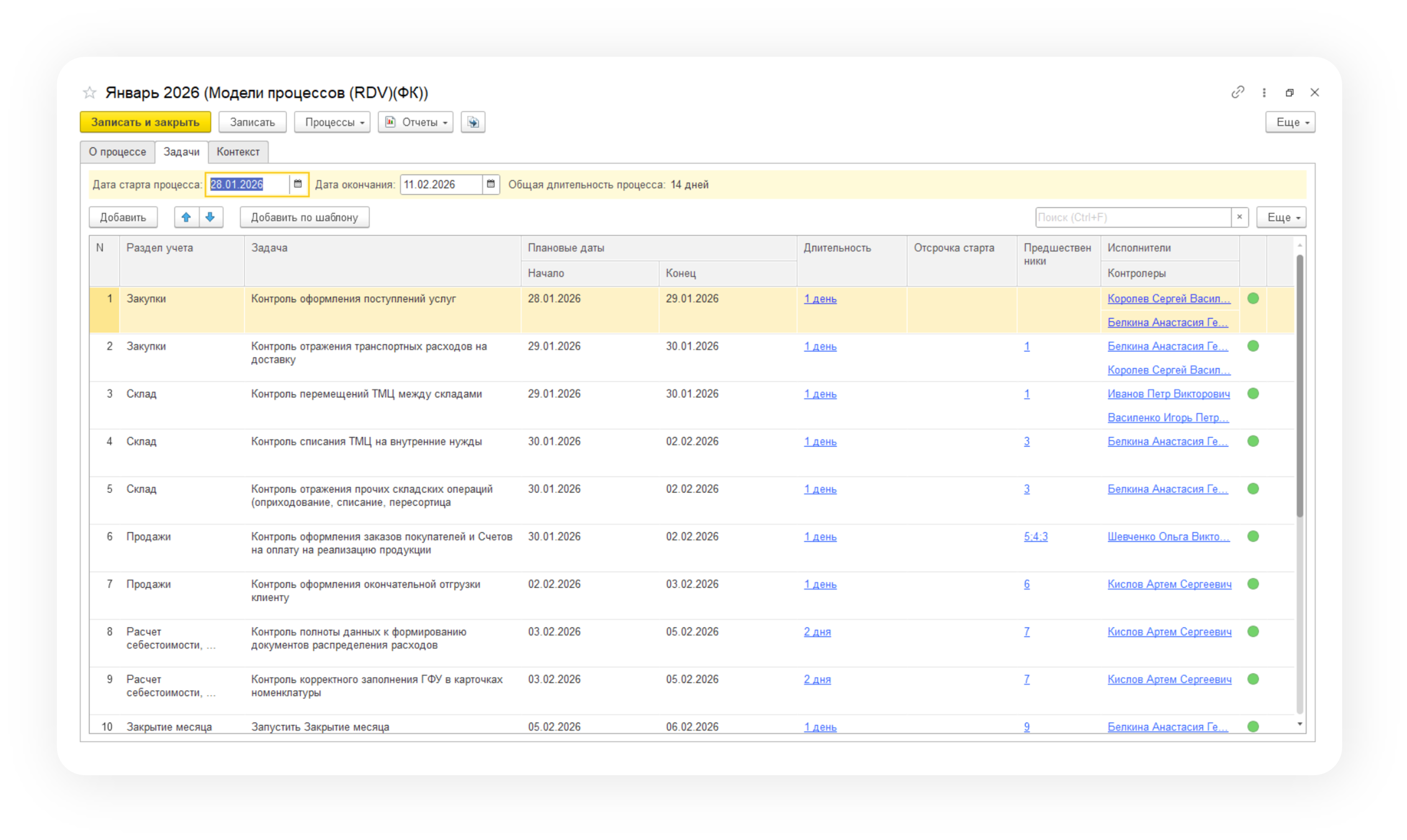 Система автоматически распределяет задачи между отделами (производство, склад, бухгалтерия и др.), позволяя выполнять этапы закрытия параллельно. -