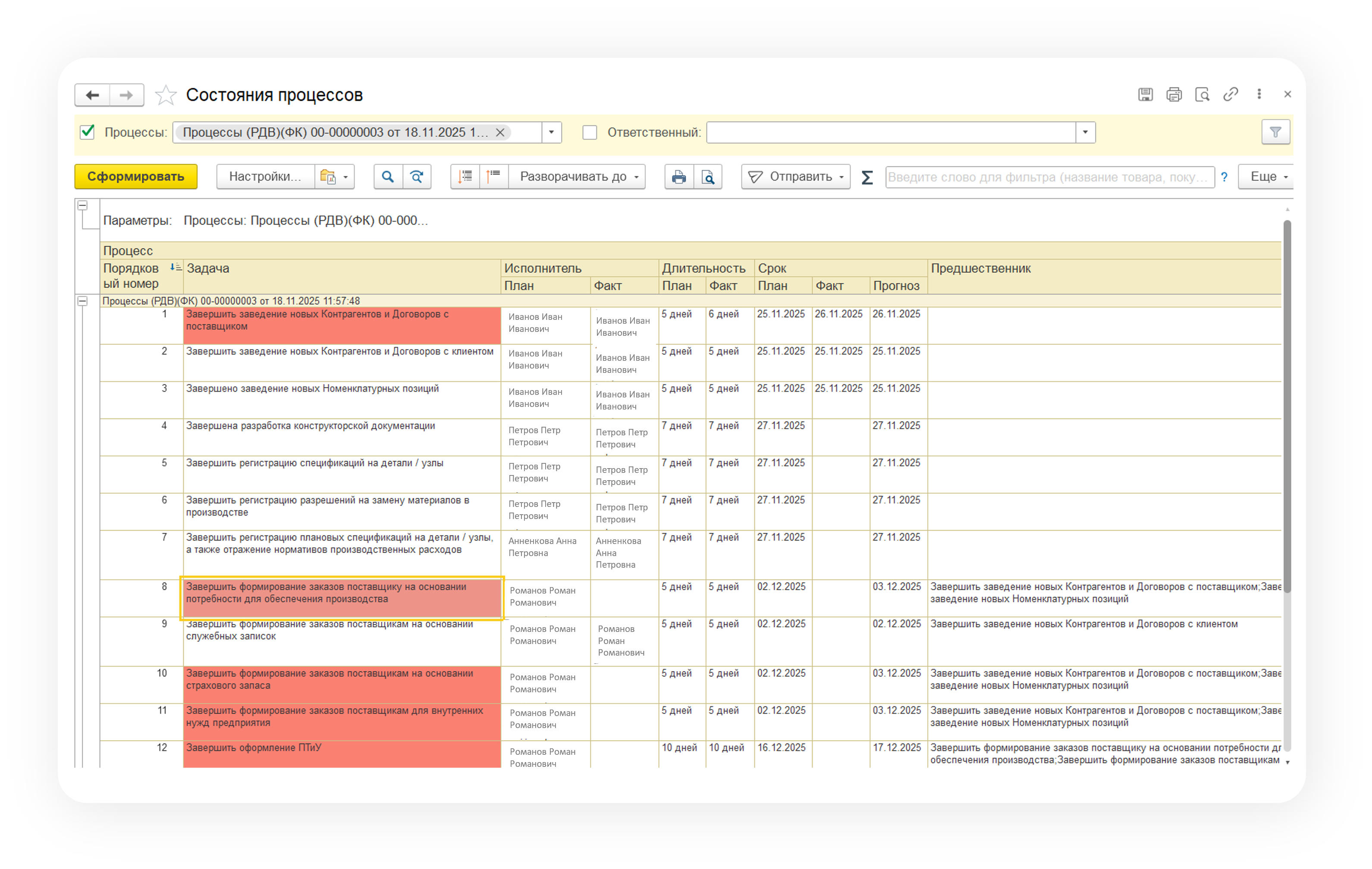 Дашборд со статистикой и возможностью управлять процессом, где наглядно видно отклонения по срокам, пробуксовка по отделам и ответственным.