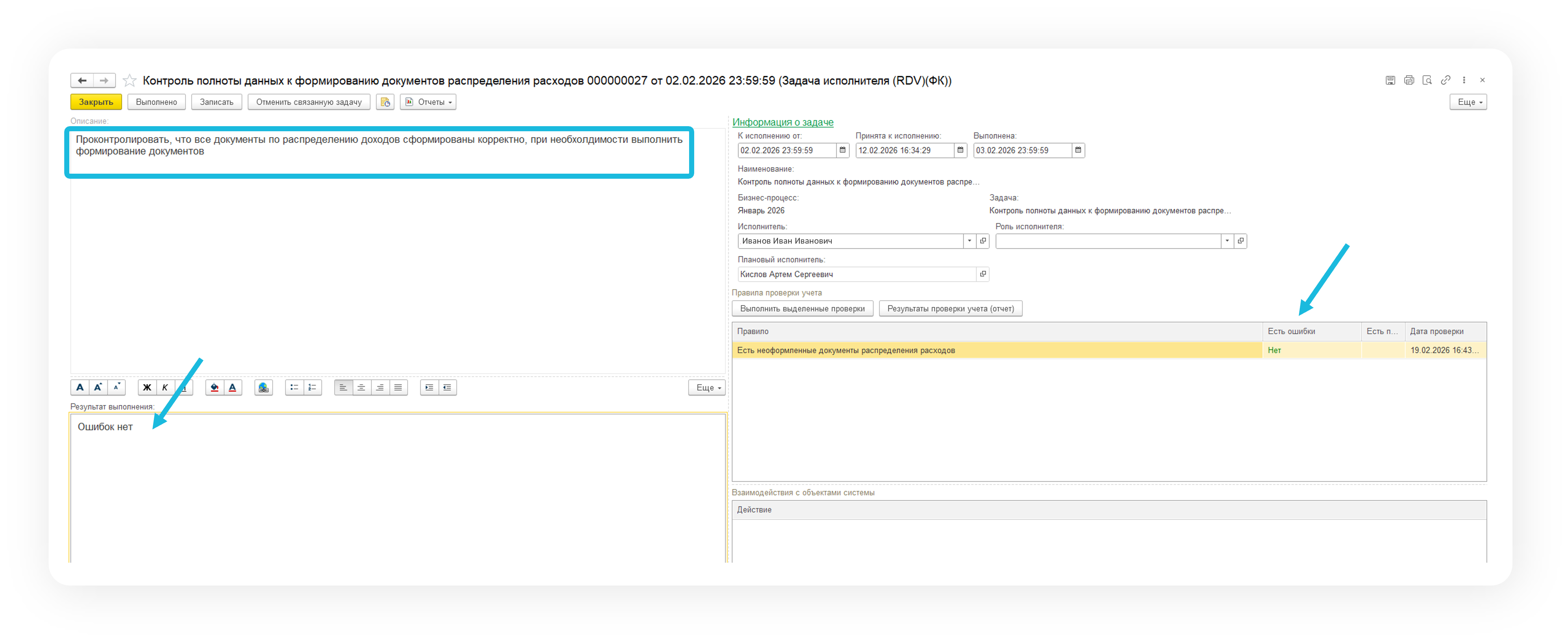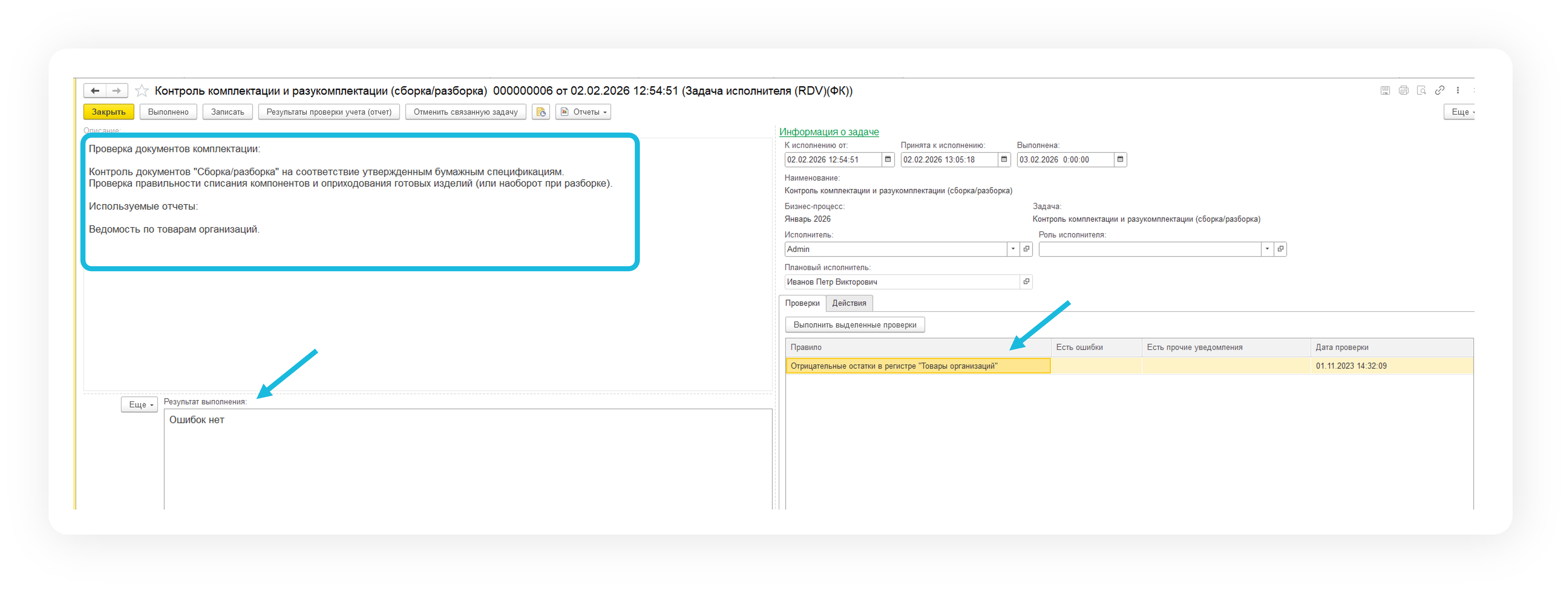 Автоматические проверки выполнения операций и проведения документов на корректность. Блокировка перехода на следующий этап при ошибках. -