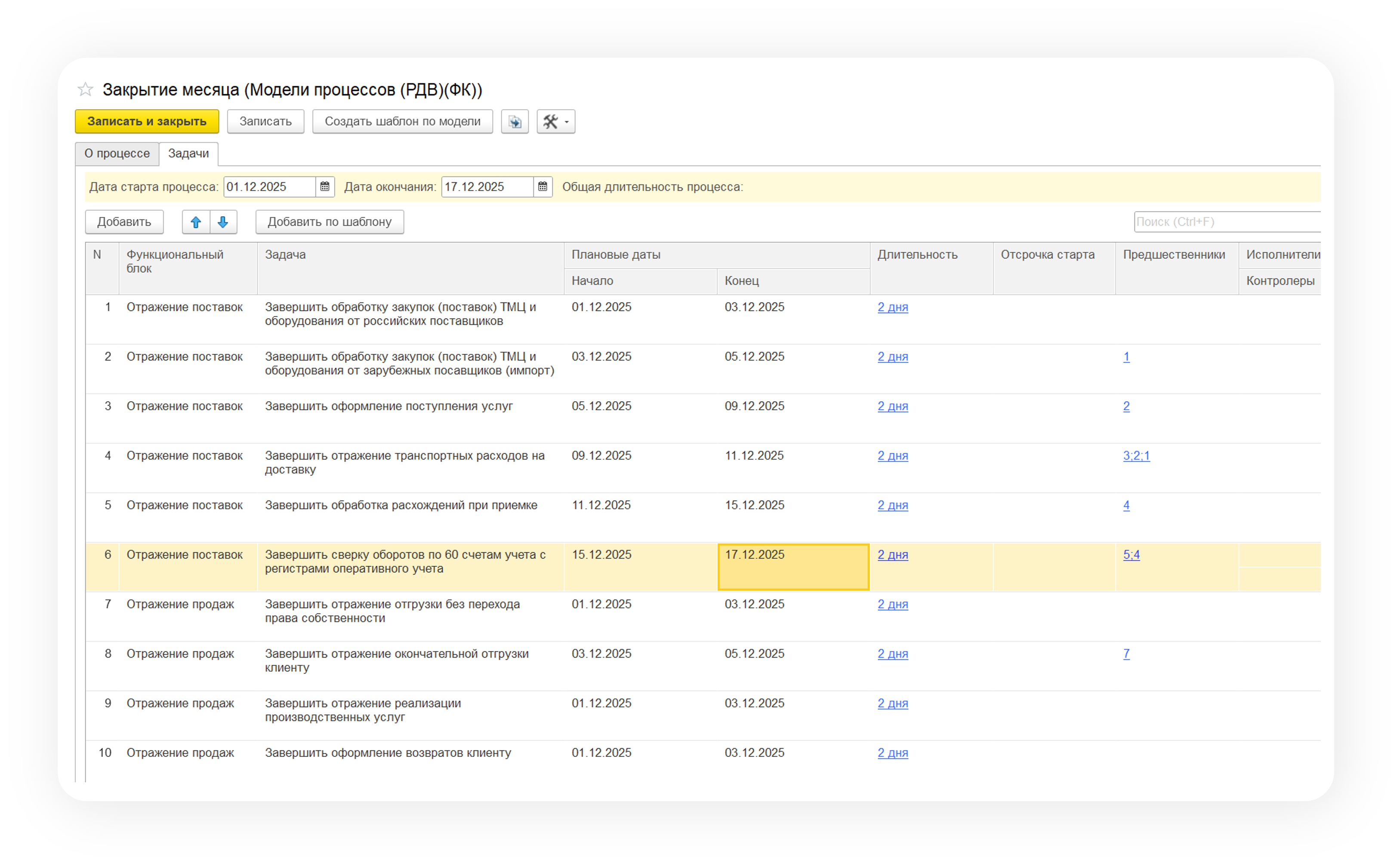 Функционал, позволяющий настраивать и изменять шаблон графика закрытия периода в компании. Реализована возможность задать блоки учета, сроки исполнения каждой задачи, назначить ответственного, определить последовательность выполнения задач и указать контрольные процедуры для проверки.